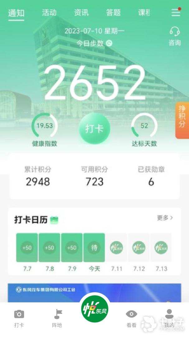 2、首页:可刷新步数,一键打卡,满足用户便捷打卡的需求,在首页还可查阅资讯、活动说明、打卡说明、领奖攻略、个人积分和常见问答等;