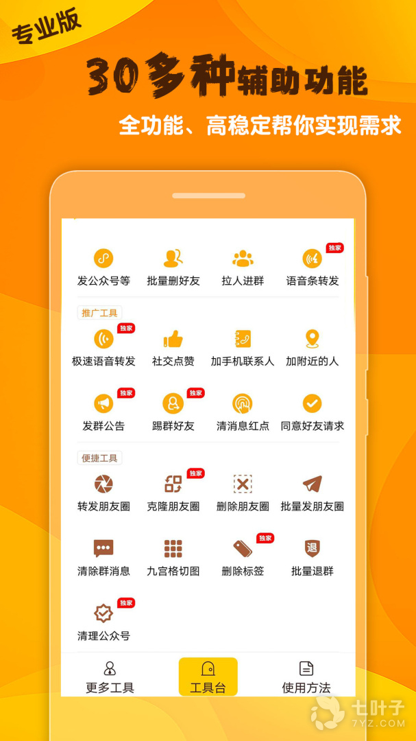 它的功能强大,集微商截图、微信加人、一键群发、检测僵尸粉、添加附近的人、添加通讯录的人、一键点赞评论于一体的的微商实用工具,可以帮助广大微商加速成长为微商大师。更有图片恢复功能,让你找回失去的图片。