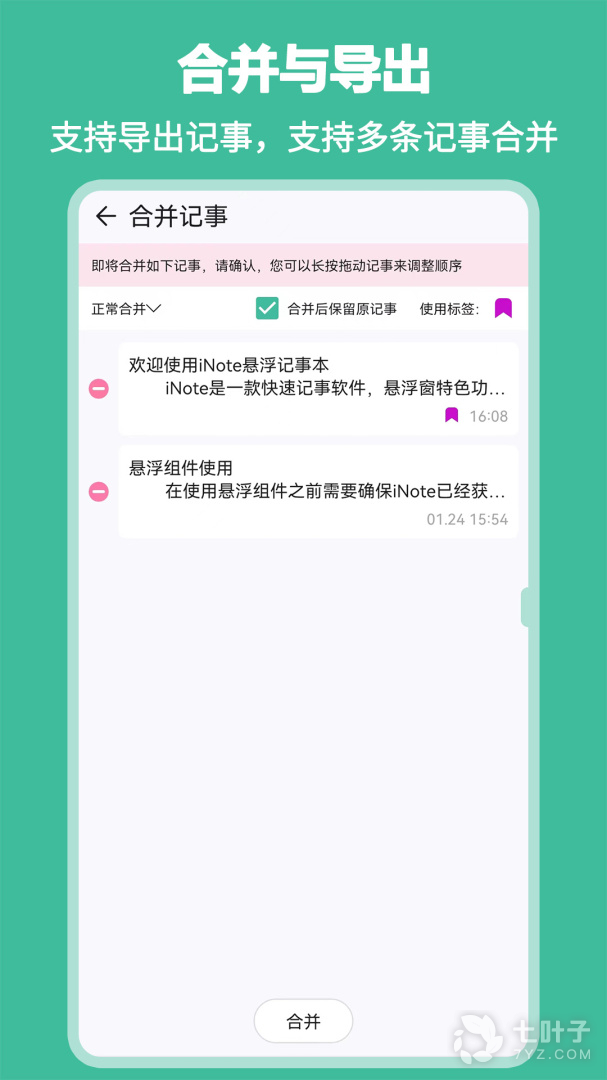 合并功能能够将多条记事合并为一条。
