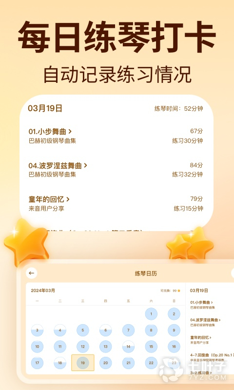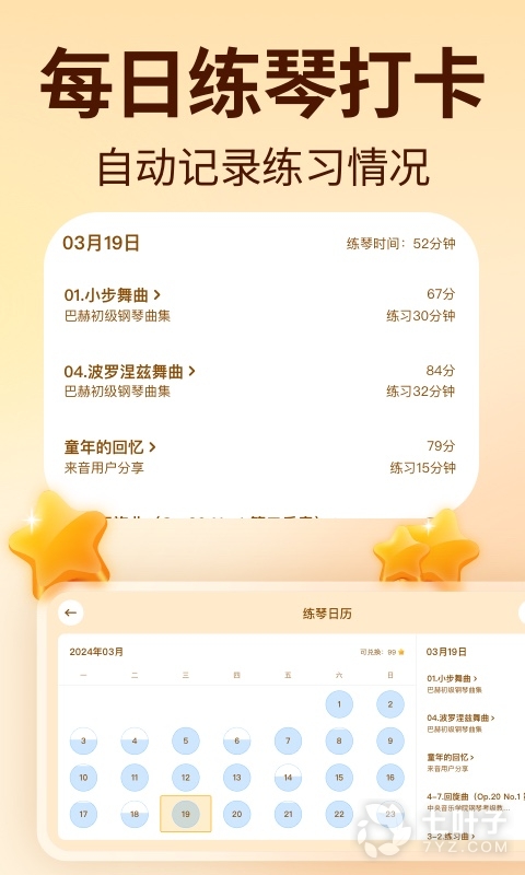 1、学习弹钢琴是现在很多家长对孩子在艺术上的期望,但是弹钢琴去培训班费钱又费力,不如用来音智能陪练APP,用手机就可以练习弹钢琴,对练钢琴很有帮助,它能自动帮我们纠错弹错之处,轻松掌握整个曲谱弹奏,它含有考级相关的全部琴谱和教材,让我们高效学习考证