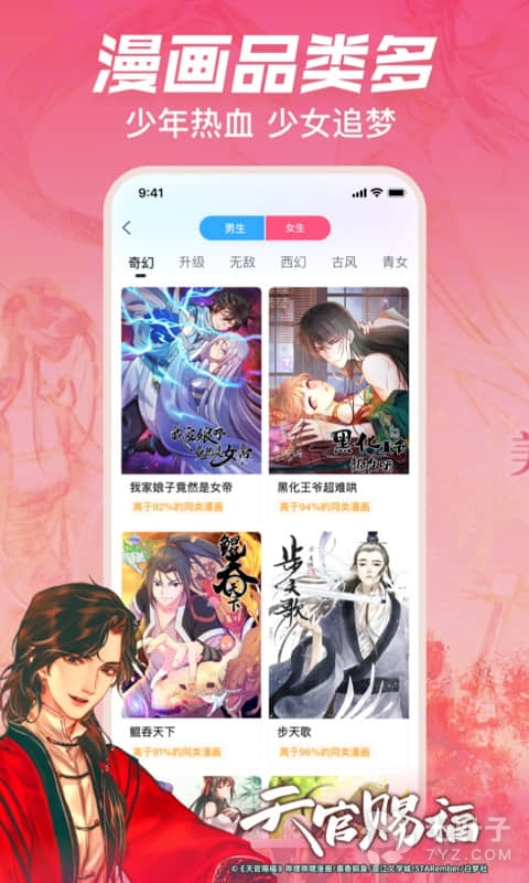 2、随时看耽美、萌系、二次元、游戏、都市生活、玄幻、魔幻、爱情等等风格的漫画。
