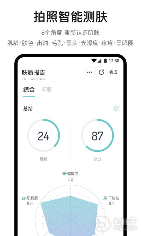 3、从肌龄、肤色、出油、痘痘、黑头、毛孔、光滑度7个角度,重新认识肌肤
