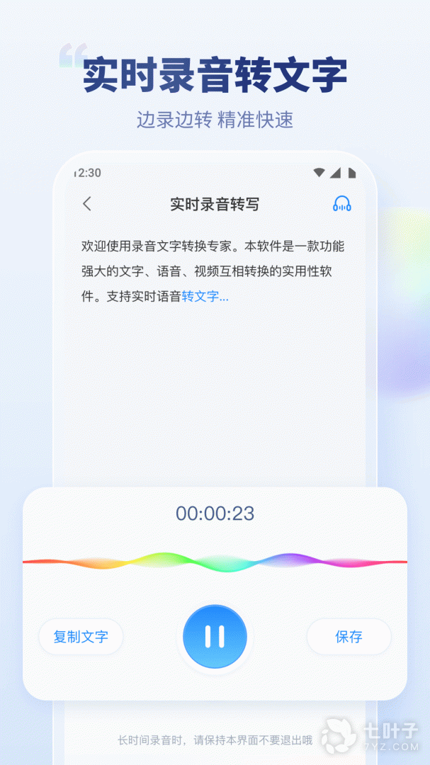 录音文字转换专家是一款以实时录音转换为文字、外部音频转换为文字、文字转语音为核心功能的办公、学习软件,可以有效满足职场上班人士、在校学生等群体在办公会议、讲座教学、课堂授课等场景下实现实时录音并同步转换为文字、将录制好的音频文件转换为文字等需求。